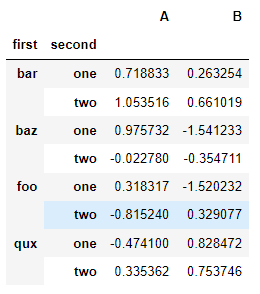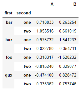 df = pd.DataFrame(np.random.randn(8, 2), index=index, columns=["A", "B"])