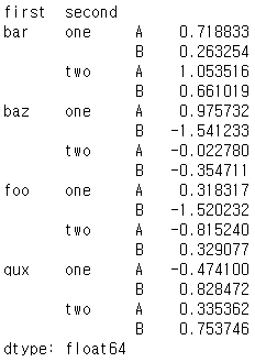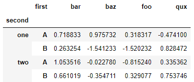 "stacked" DataFrame 또는 Series(MultiIndex를 인덱스로 사용)에서 stack()의 역 연산은 기본적으로 마지막 레벨을 unstack 하는 unstack()입니다.