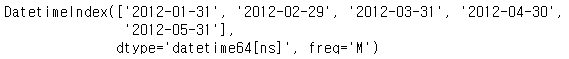 rng = pd.date_range("1/1/2012", periods=5, freq="M")