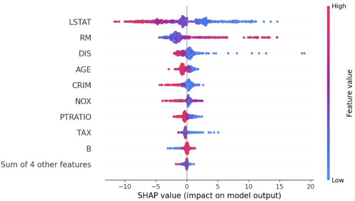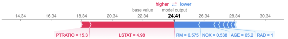 이것은 예를 들어 높은 LSTAT(인구의 낮은 지위 %)가 예상 주택 가격을 낮춘다는 것을 보여주고 있어요.