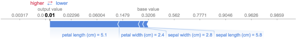 # 첫 번째 예의 Setosa 출력에 대한 SHAP 값을 플로팅 합니다.